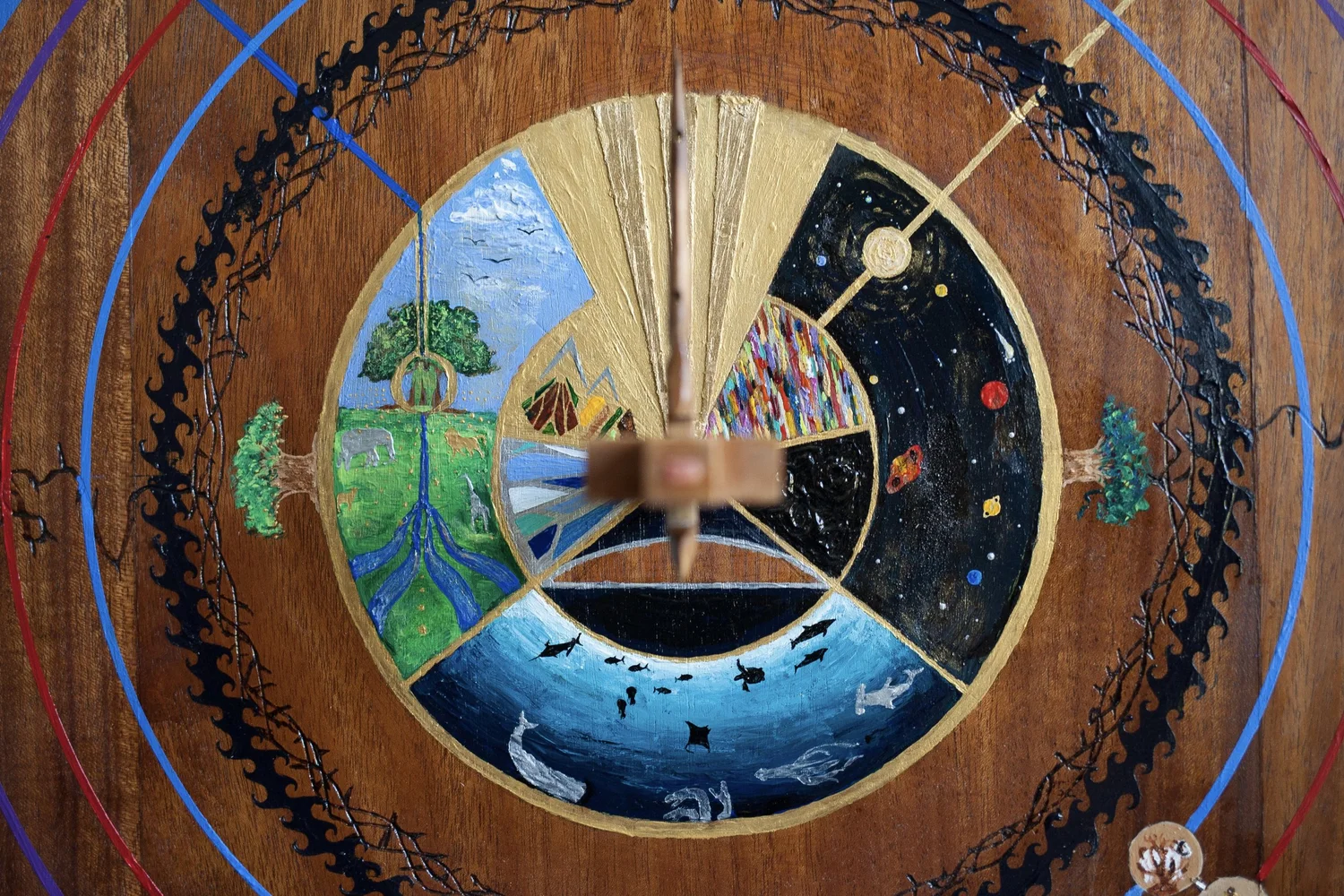 The other challenge this created was with the time-telling itself. Previous clocks have featured long brass hands that reach out to the outermost circle of the “present” and having two hands to indicate both the time of year and the day of the week would only end up obscuring much of the painting and many of its minute details. After some puzzling, I settled on a very thin hand for the days of the week and the use of a magnetic token that affixes to the face of the clock. Magnets. They’re like magic. I inlaid some thick gauge steel wire flush with the face of the clock right beneath the outermost ring of paint, and found a neodynium magnet. These are strong rascals, but between the minimal mass of wire and the interference from things like wood and woodglue, it’s just strong enough to stay where you put it without having to fight it.